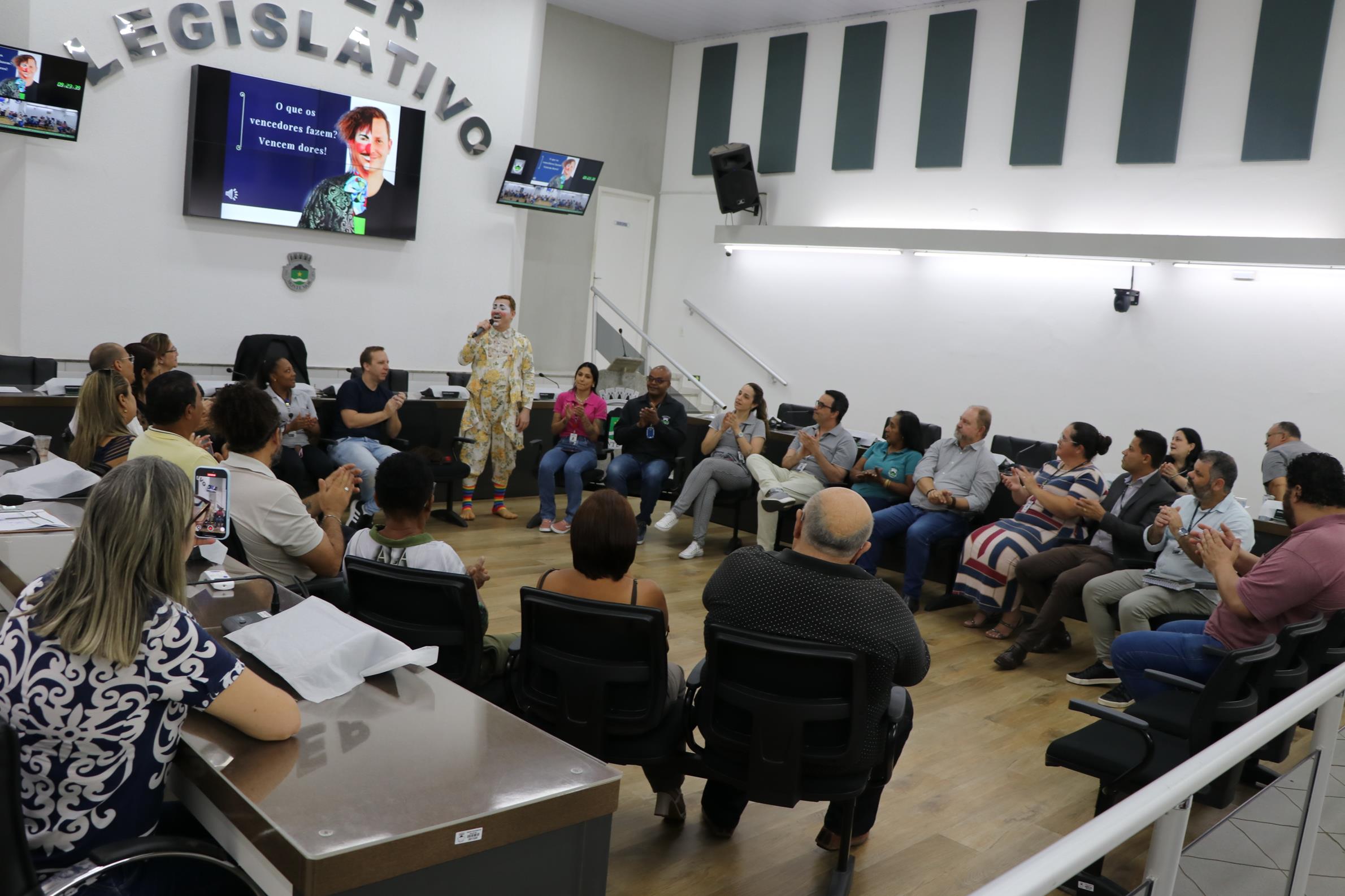Psicólogo e palhaço, palestrante destacou que a saúde mental precisa ser “prioridade”O Plenário da Câmara recebeu a palestra “Reflexões de um palhaço e a saúde mental”, ministrada voluntariamente pelo psicólogo Rafael Magalhães, também conhecido como Tio Rafa.