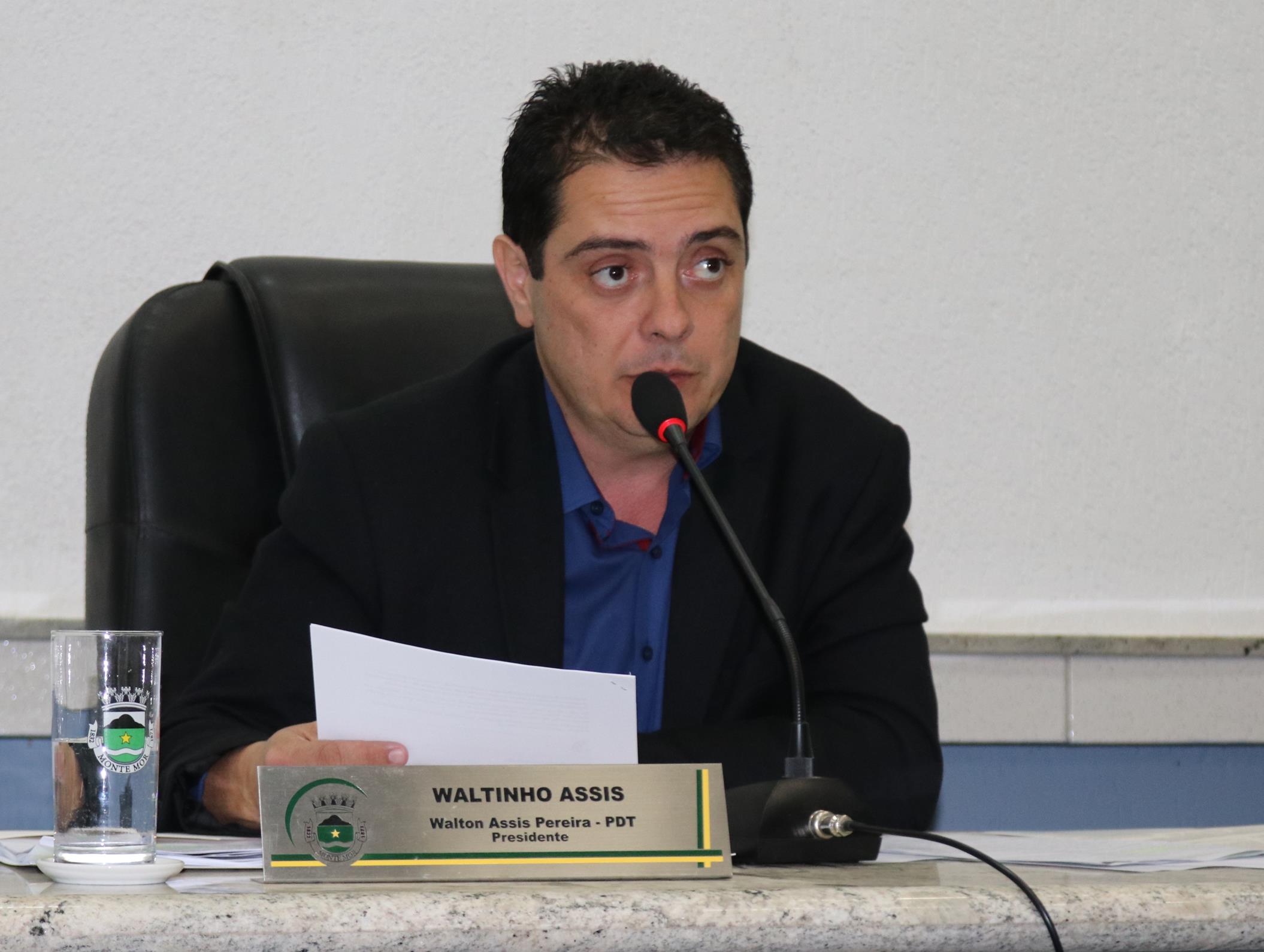 O vereador Waltinho Assis, durante discurso no plenário da Câmara: três indicações ao Executivo foram lidas na sessão13/07/2018 - Três indicações do vereador Waltinho Assis (PDT), presidente da Câmara, foram lidas esta semana em plenário. Na indicação 332/2018, sugere-se ao Poder Executivo a criação de um programa para valorização de iniciativas culturais. Já a indicação 333/2018 reivindica a implantação do “Projeto Geladeira Solidária e Prateleira Solidária”, no município.