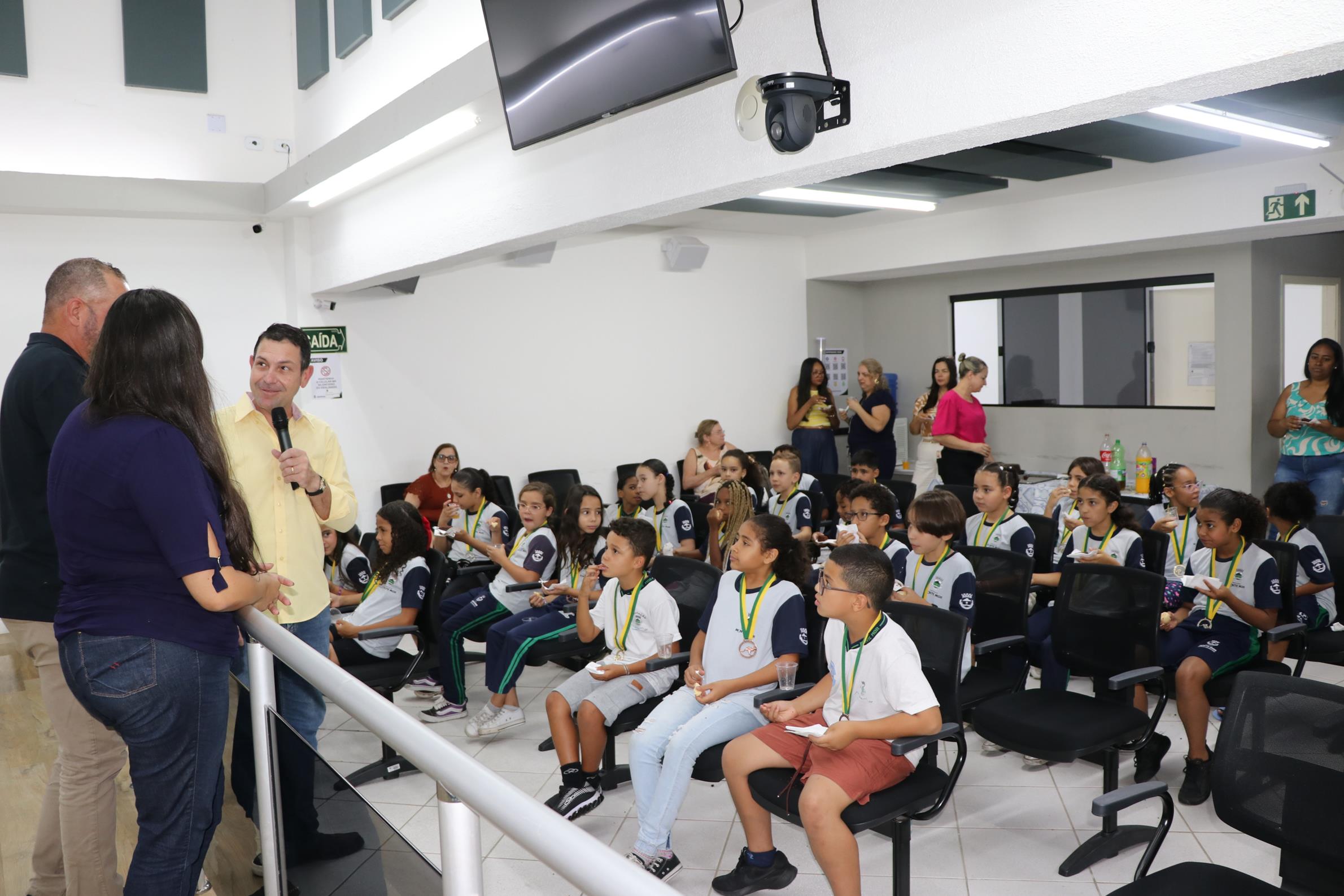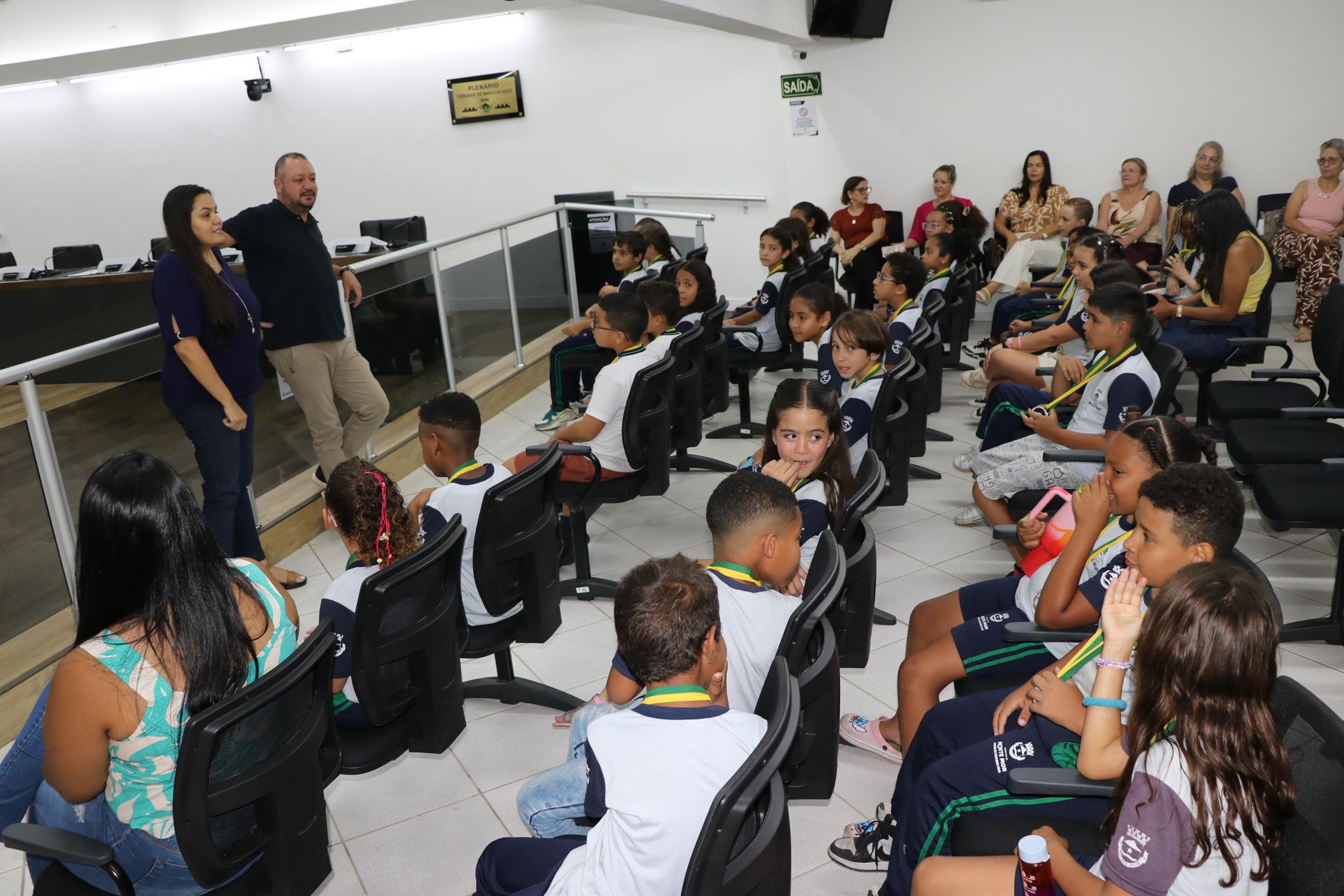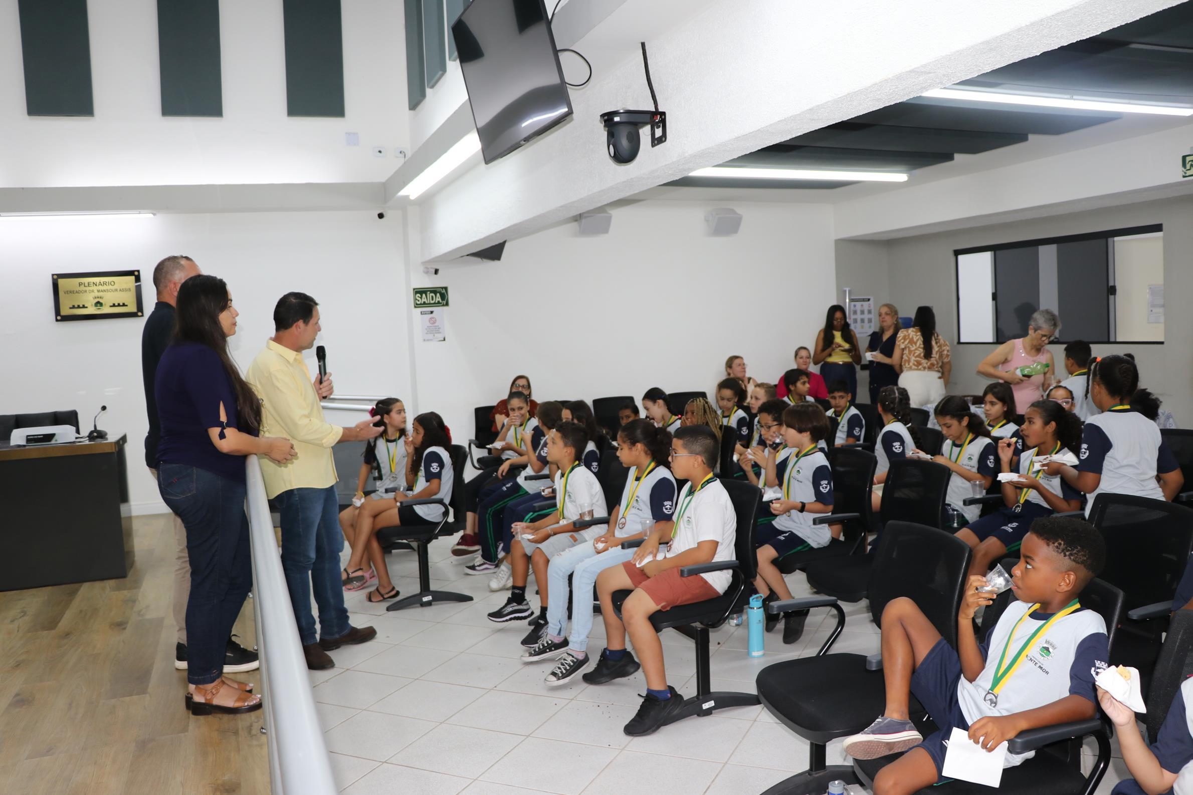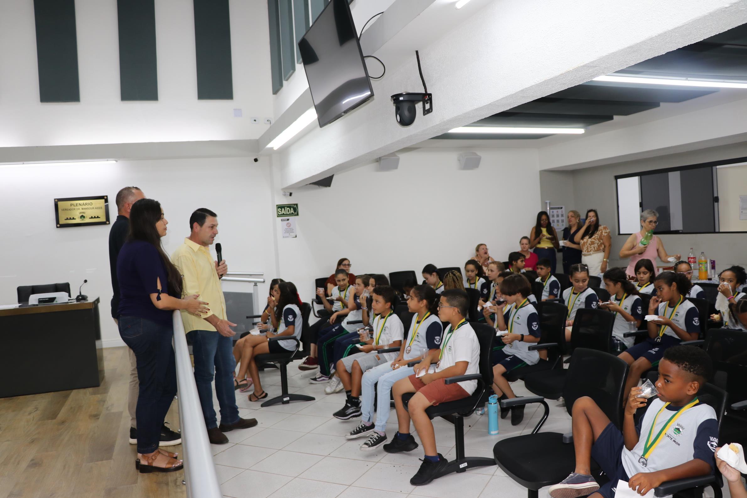 O prefeito Murilo Rinaldo e o presidente Beto Carvalho com alunos e professores da escolaAlunos da Escola Municipal Leonardo Rodrigues da Silva visitaram a Câmara na tarde desta terça-feira (2).