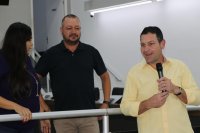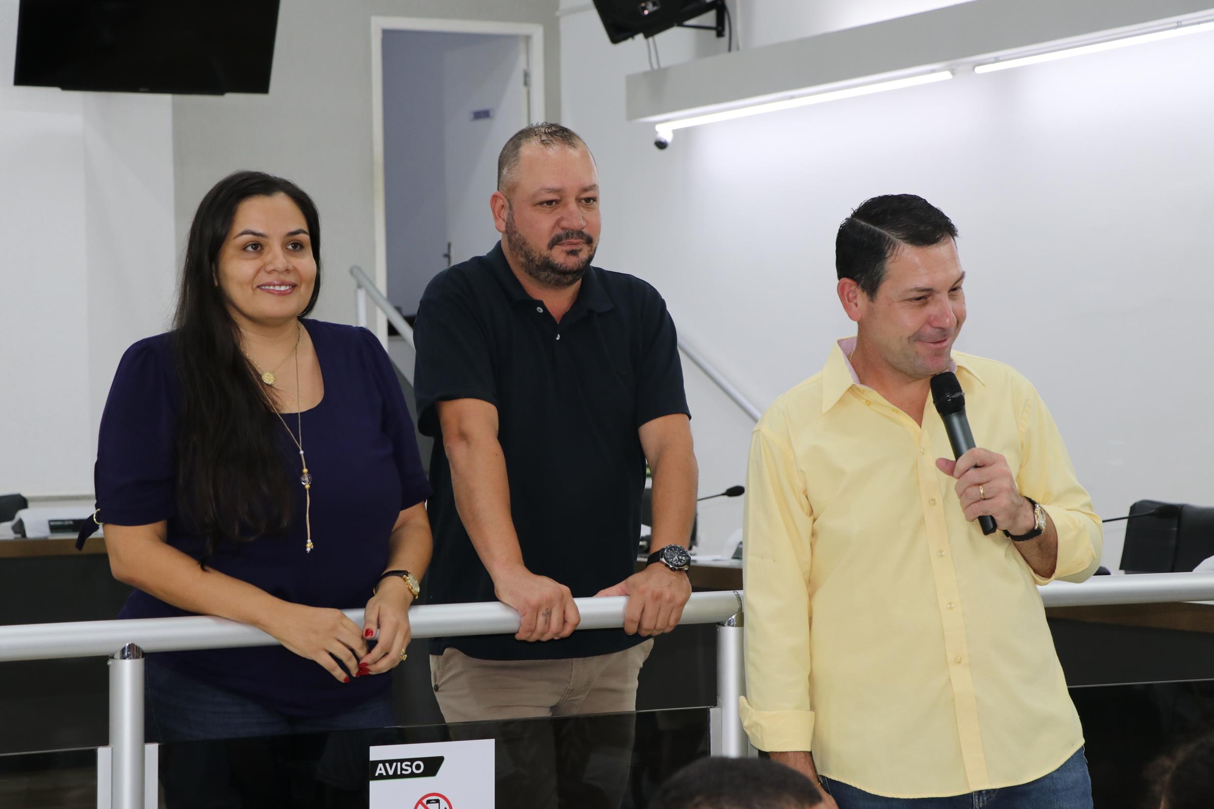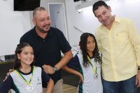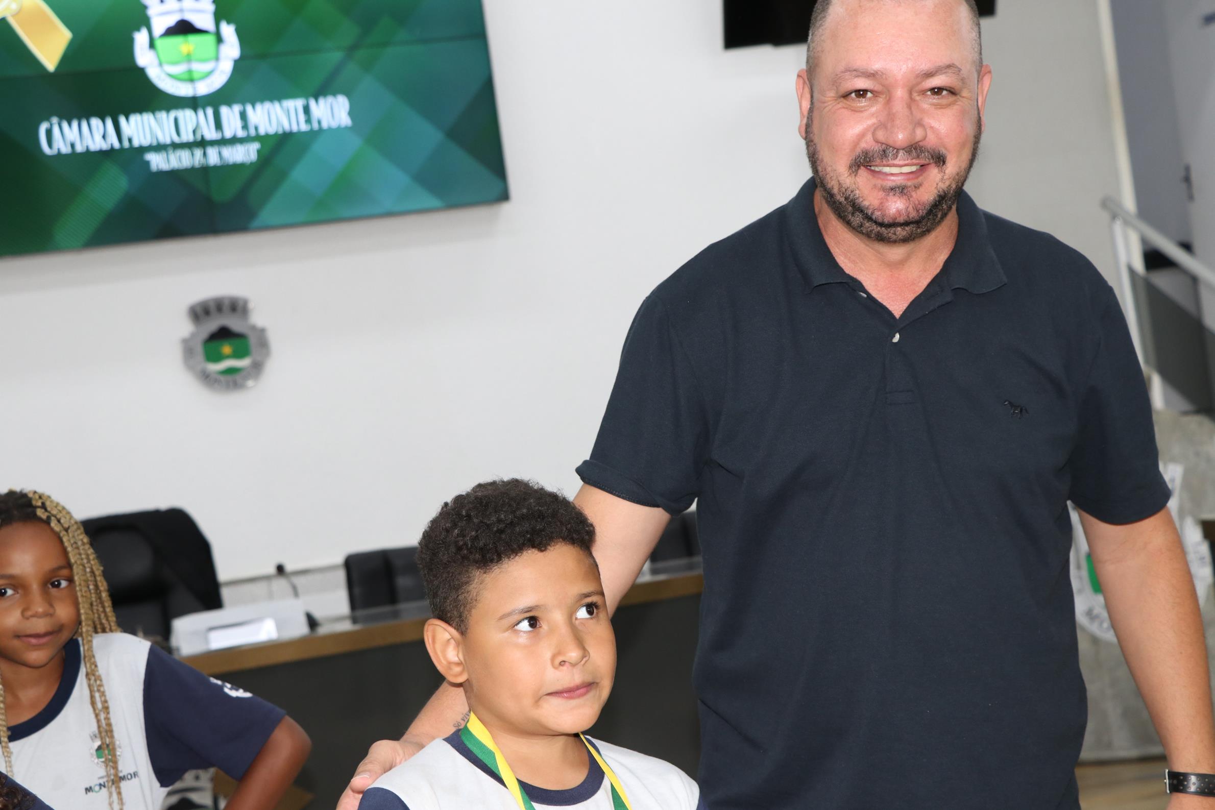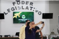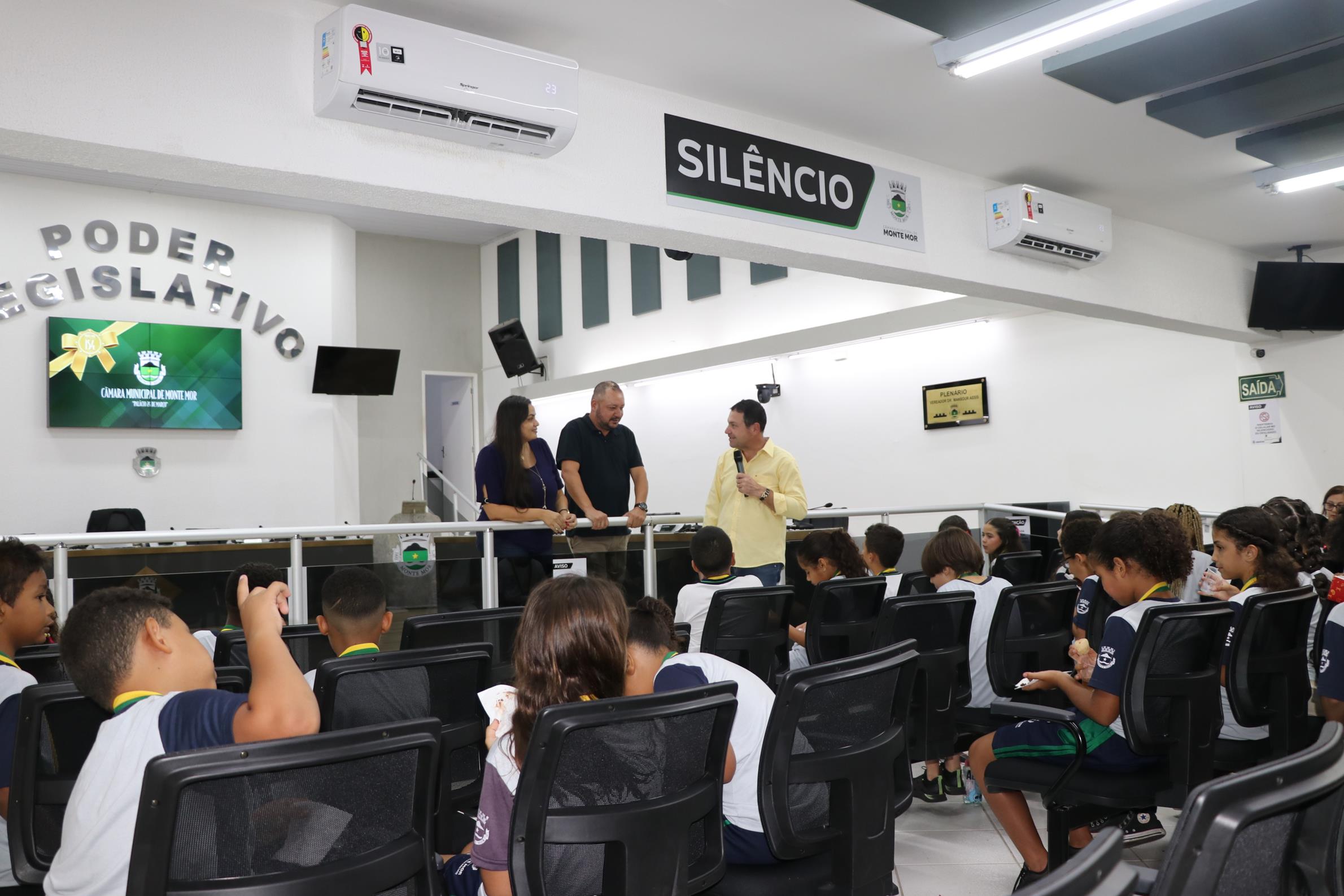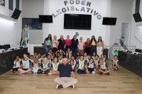 O prefeito Murilo Rinaldo e o presidente Beto Carvalho com alunos e professores da escolaAlunos da Escola Municipal Leonardo Rodrigues da Silva visitaram a Câmara na tarde desta terça-feira (2).